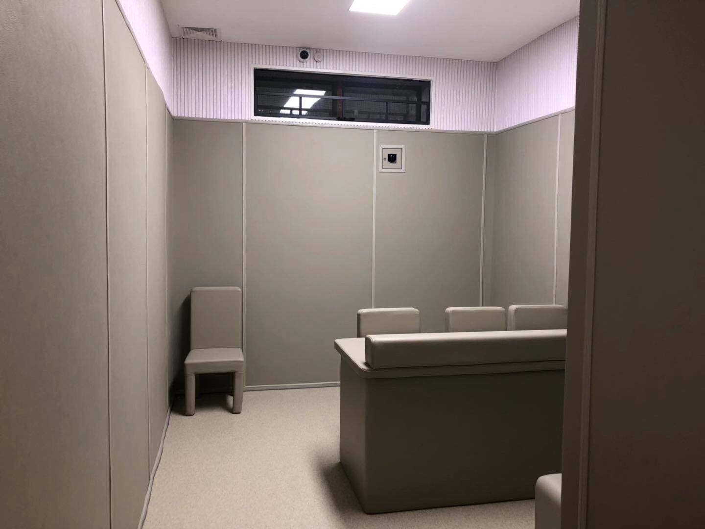 審訊室內(nèi)軟裝裝飾中所用的防撞材料核心基材是進(jìn)口優(yōu)質(zhì)防撞棉材料/高密度納米分子材料,經(jīng)專門設(shè)備加工而成17-25mm厚度的防撞軟包墻板,審訊室軟包規(guī)格為1250*2450mm,17mm/20mm/25mm厚度,B1級阻燃,E0級環(huán)保。材質(zhì)均勻堅實,并且經(jīng)復(fù)合皮革處理后防撞系數(shù)高,且不易斷裂,抗沖擊,耐磨,不易劃破,清潔方便等。