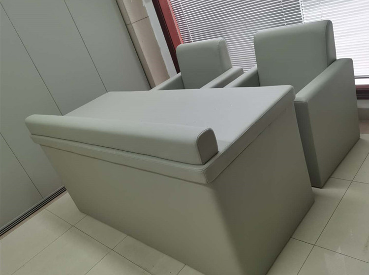 紀(jì)委審訊室防撞軟包墻面常用規(guī)格為1250*2450mm,防撞材料基材為無膠復(fù)合工藝的聚乙烯發(fā)泡棉,等級為B1級阻燃,E0級環(huán)保。墻面高于2.4米的部分采用阻燃吸音板,達到室內(nèi)錄音清晰的效果。