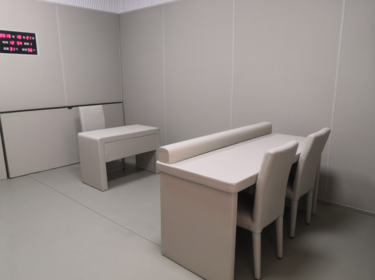 完善整墻,一般紀(jì)委談話室等公檢法辦公室都是3米高的墻,2.45米以下使用防撞墻板滿鋪,剩余高度我們是建議在防撞墻面上安裝木質(zhì)吸音板,不但可以吸音降低室內(nèi)回音,還可以達到墻面裝飾美觀的效果,質(zhì)量好實用性強而且經(jīng)濟實惠。